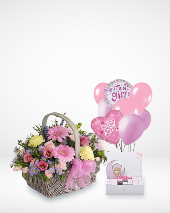 440G Patchi Mix Chocolate – Baby Girl Bundle Balloons – Flower Basket