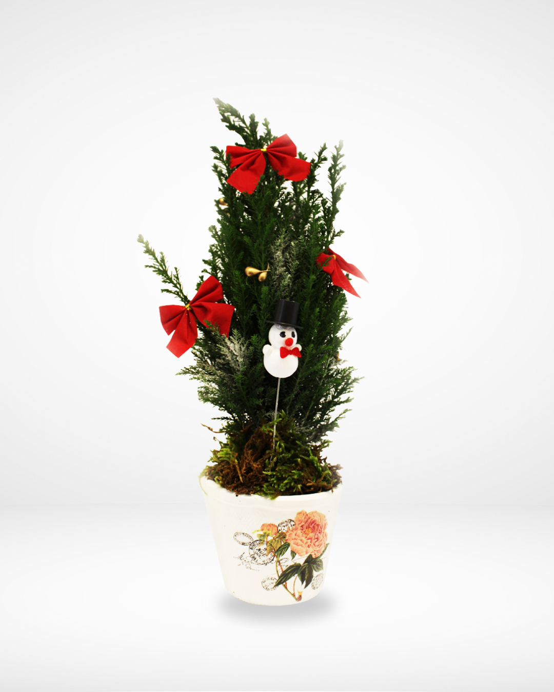 A beautiful Ellwoodii plant in a pot decorated with red ribbons