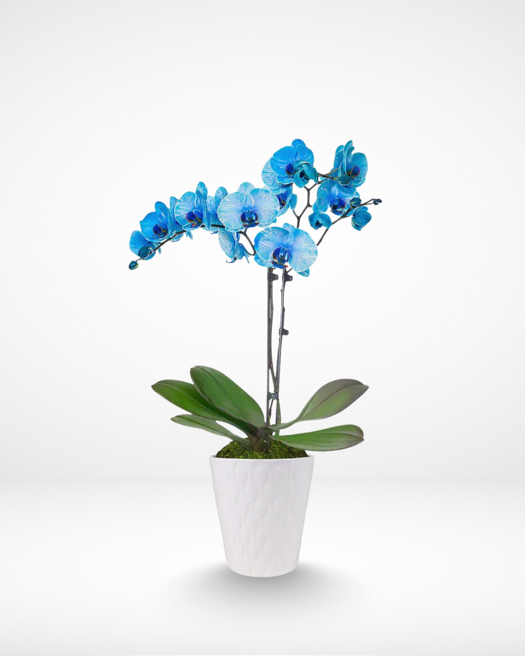 Double-stemmed blue Phalaenopsis orchid in a pot , delivered directly to your doorstep .
