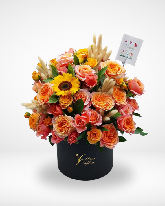 Box of colorful flowers and sunflowers