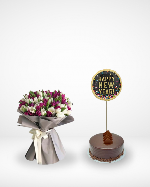 A Bouquet of 50 white and purple tulips with chocolate cake and hapy new year balloon.