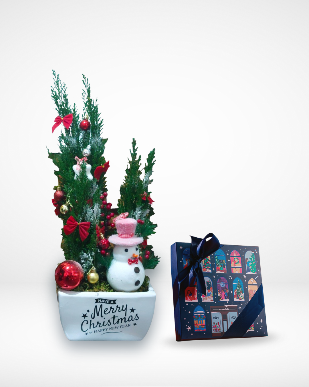 Christmas arrangement paired with a box of 480g assorted chocolates.