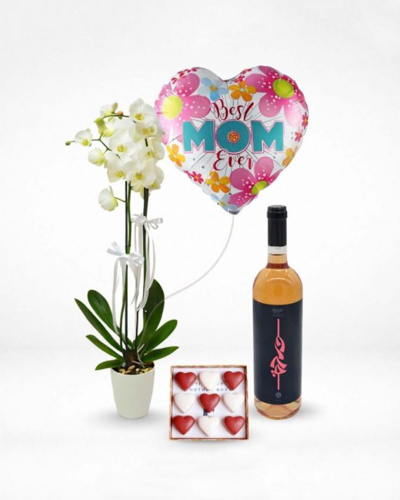 Pamper Mom with Sweet Elegance for Mom: a beautiful white orchid, a bottle of wine, 9 delicious chocolates, and a cheerful balloon for a truly memorable Mother’s Day. Same day delivery all over Lebanon.