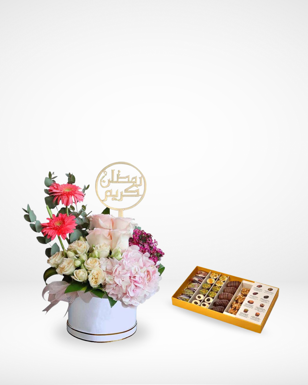Box styled with pink roses and colorful Ramadan vibes with Patchi dates and nuts.