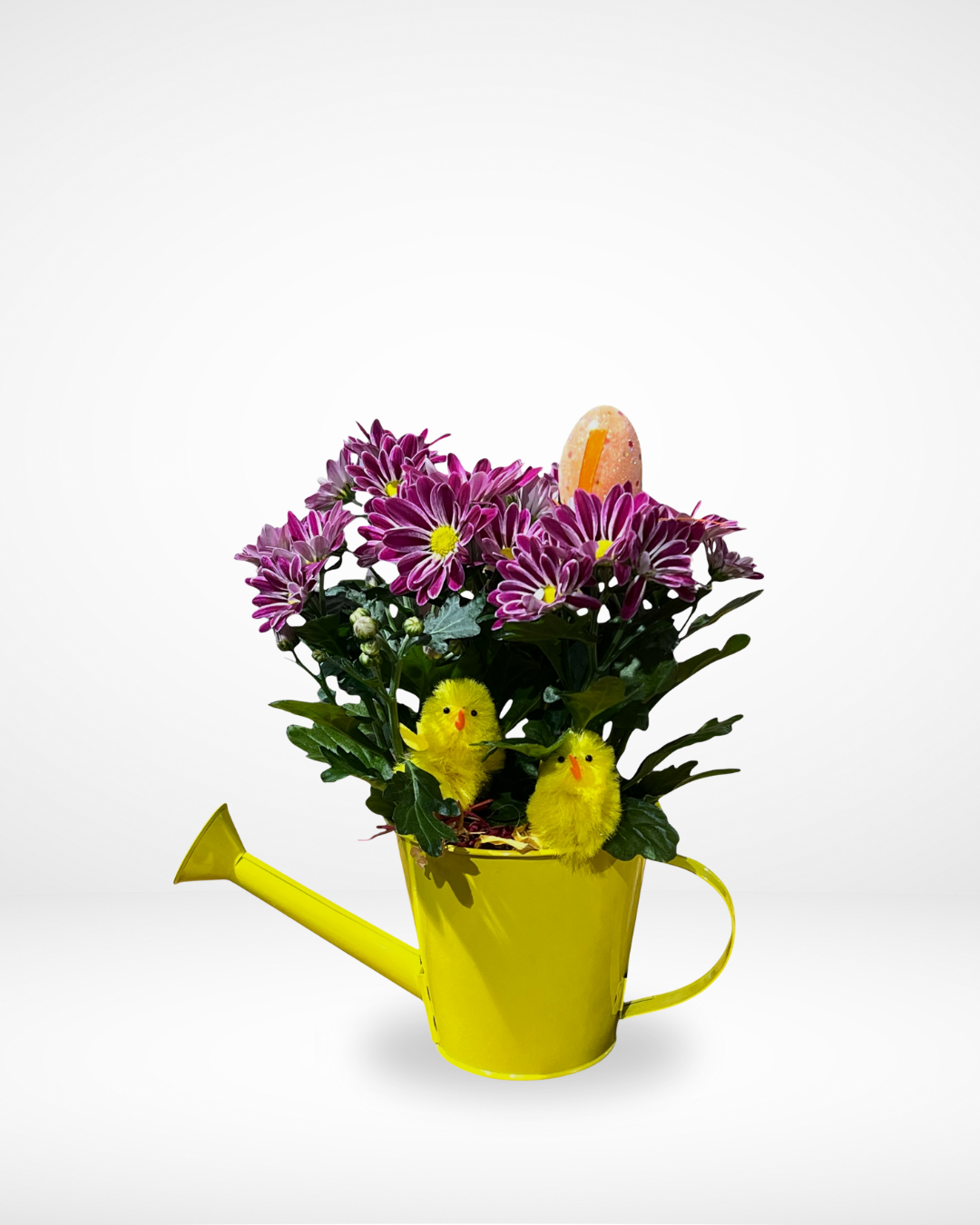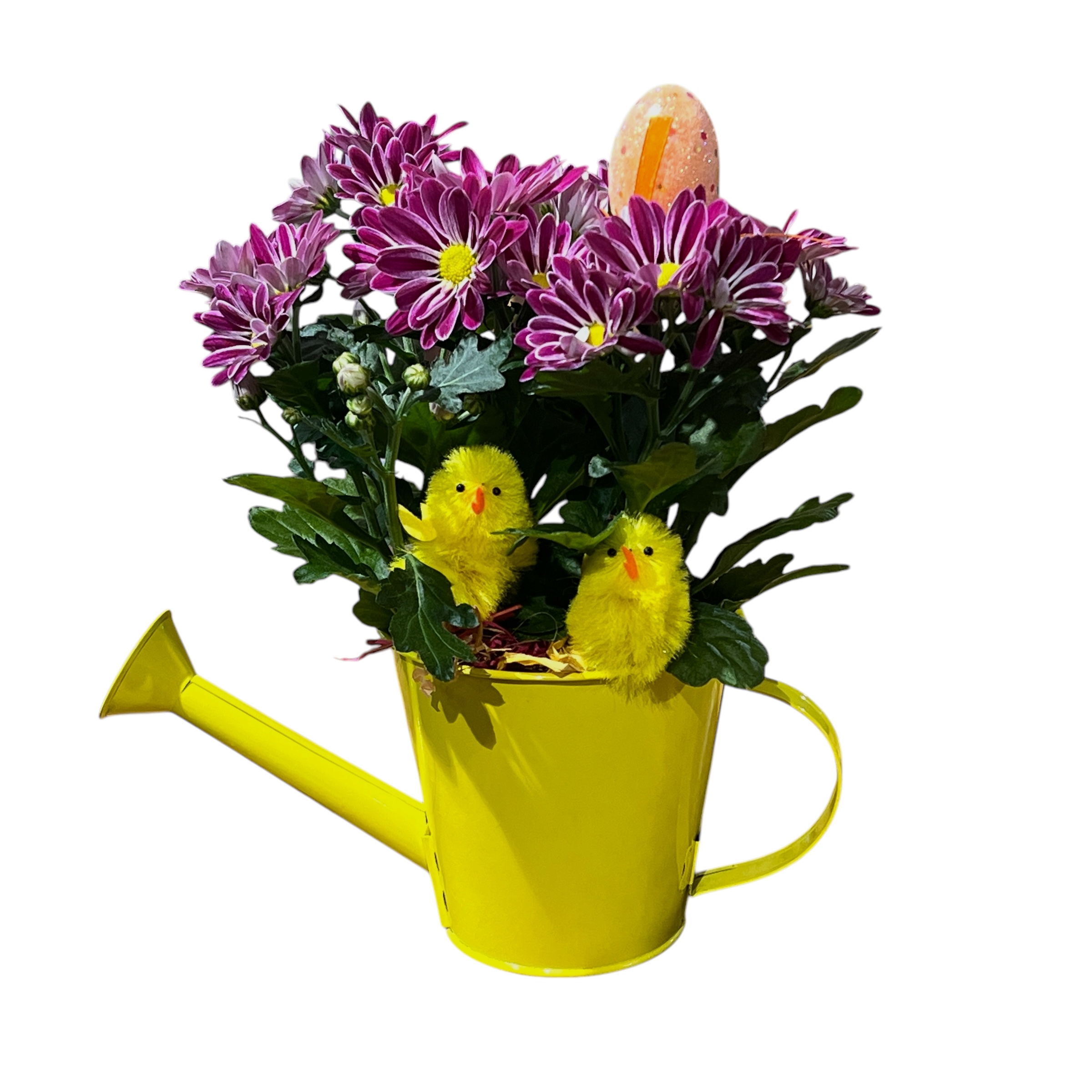 A charming Easter arrangement with two adorable chicks in a special pot.