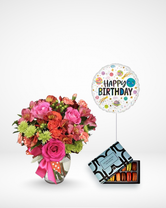 Floral Vase with 12 pcs of Macarons and Balloon