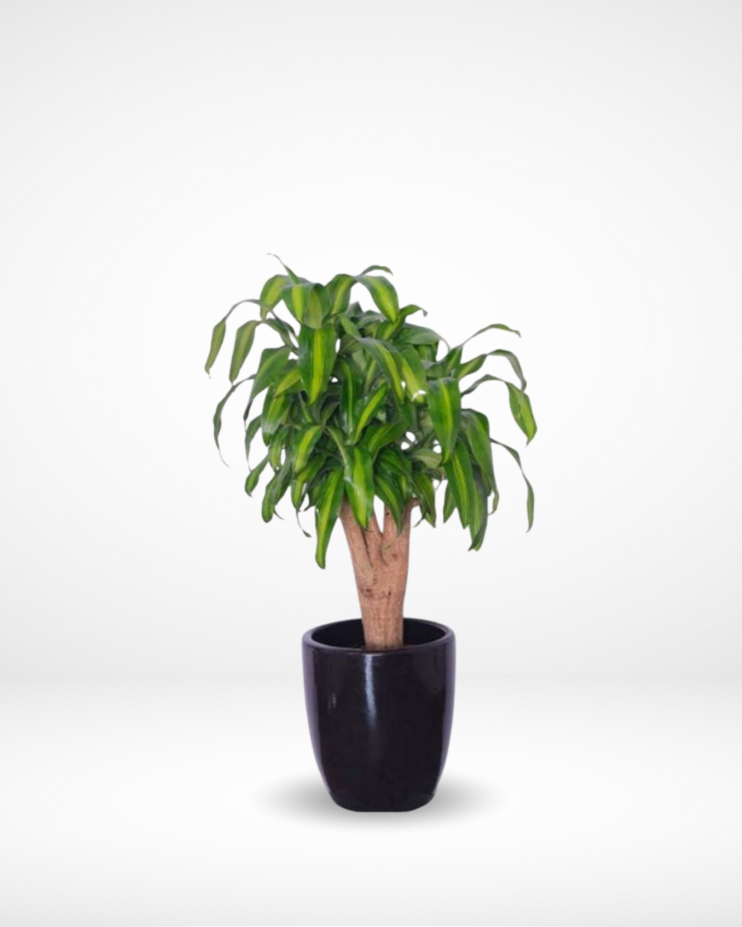Dracaena Massangeana, commonly known as corn plant, is a popular houseplant native to tropical Africa. It features long, glossy green leaves with yellow or cream-colored stripes, often arranged in rosettes at the top of a tall, woody stem. Known for its upright growth and attractive appearance, it can grow several feet tall indoors. Dracaena Massangeana thrives in bright, indirect light and requires moderate watering, allowing the soil to dry out between waterings. It is also valued for its air-purifying properties, making it a great addition to home or office environments. Although relatively low-maintenance, it should be kept away from drafts and direct sunlight to prevent leaf scorch.