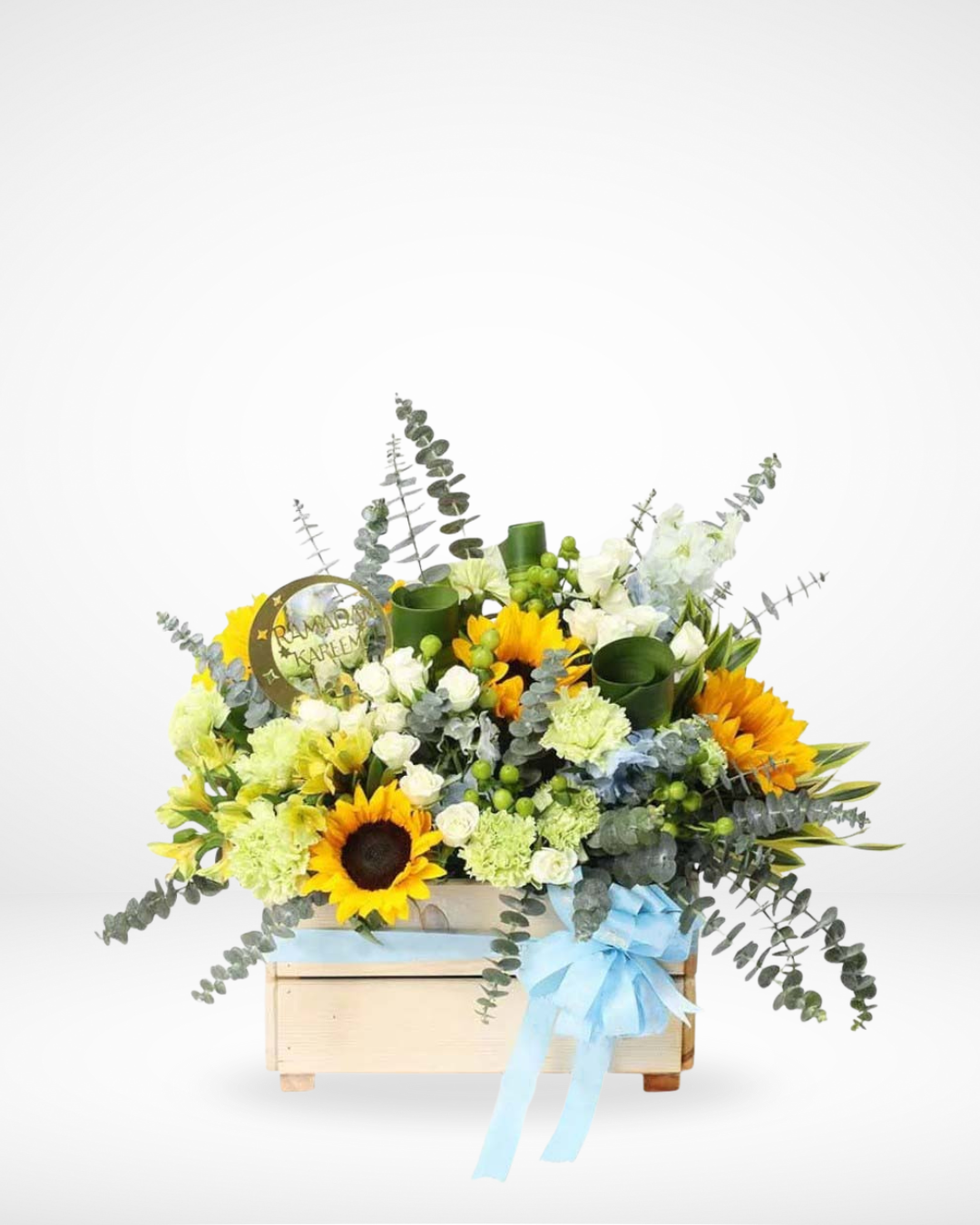 Moon shaped arrangement with Patchi lantern chocolate arrangement.