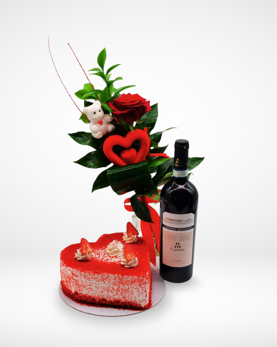 The special red rose with a red wine bottle and a heart shape red velvet cake