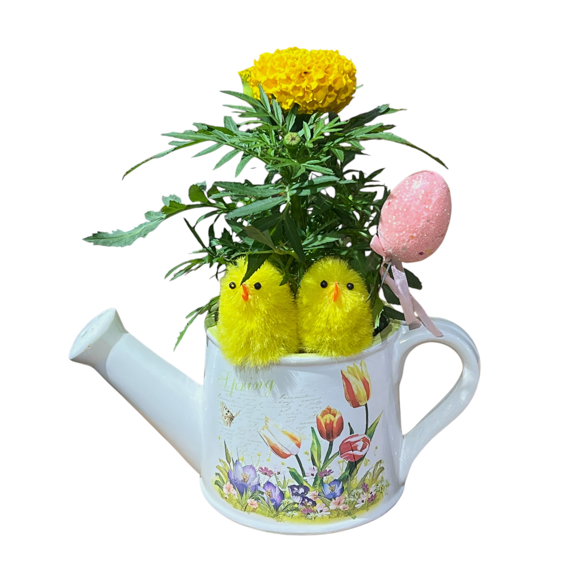 A sweet Easter arrangement with two adorable chicks in a special pot.