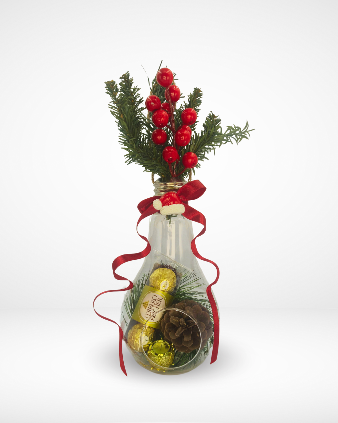 This charming gift illuminates the spirit of the holidays! A distinctive light bulb-shaped vase is filled with delicious Ferrero Rocher chocolates, nestled among festive sprigs and pinecones. We guarantee same day delivery in Beirut and all over Lebanon!