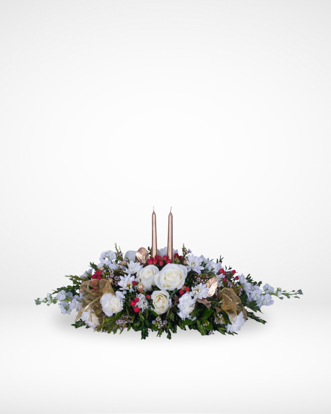 Center Piece mixed by white flowers and a gold Christmas accessories