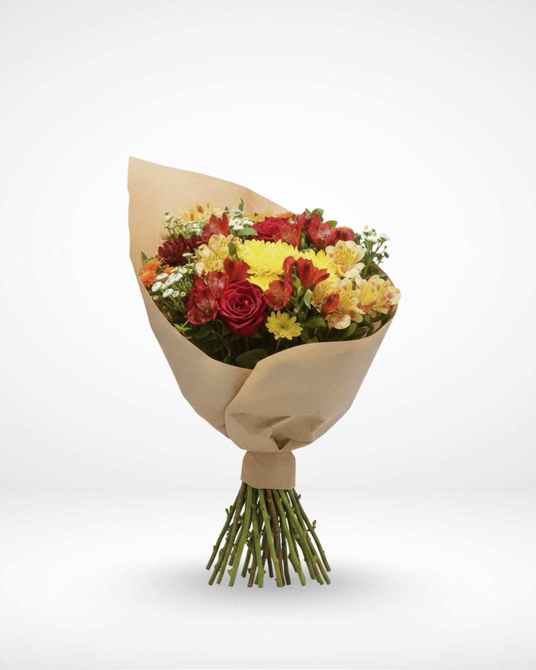 A Bouquet Of Red, Orange, And Yellow Flowers