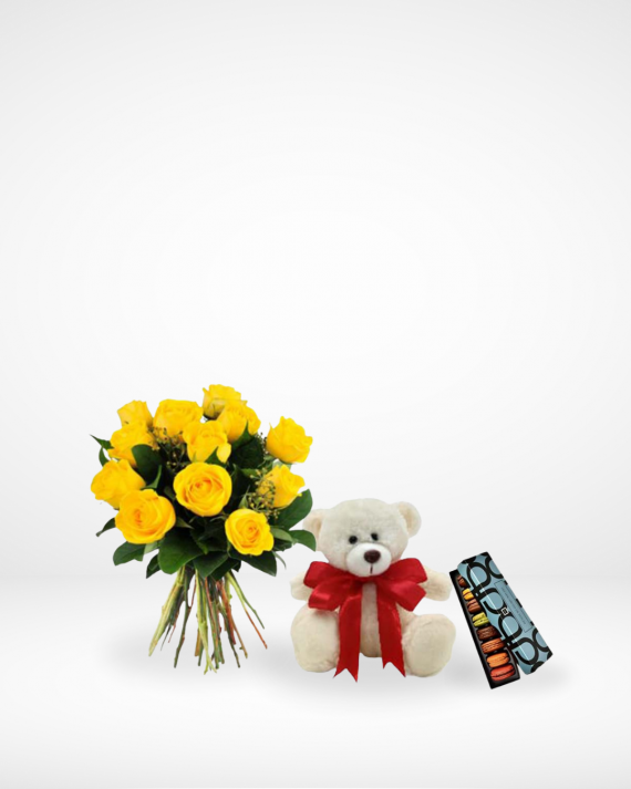 12 Warm Yellow Roses with 8 pcs of Patchi Macarons and white Bear.