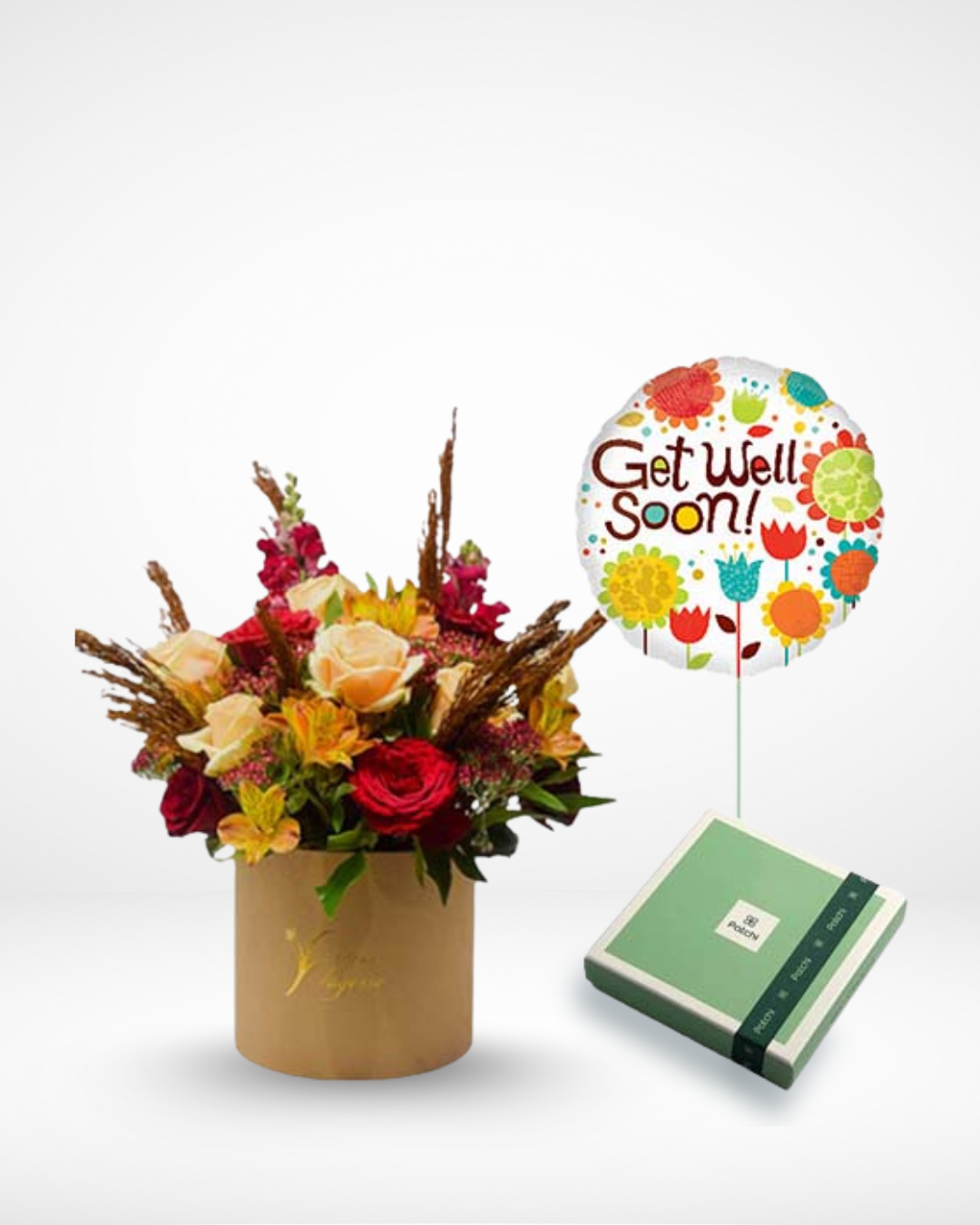 Floral Arrangement with 16 pcs of Patchi Chocolate and a Balloon