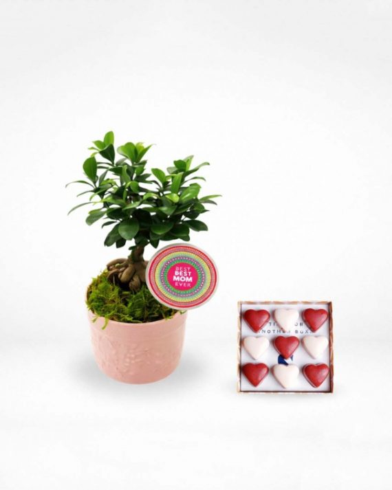 Delight Mom with Heart & Harmony for Mom: a beautiful bonsai, 9 heart-shaped chocolates, and a festive balloon to show your love this Mother’s Day. Same day delivery all over Lebanon.