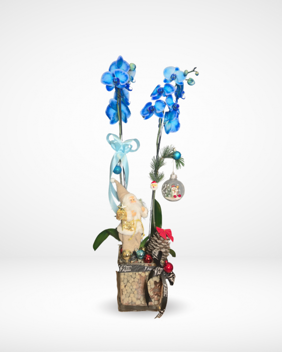 The vibrant blue orchids provide a beautiful contrast to the silver and white Santa figure and coordinating blue ornaments. It’s an unforgettable, modern gift that adds a touch of cool elegance and luxury to any winter décor. Same day delivery all over Lebanon!