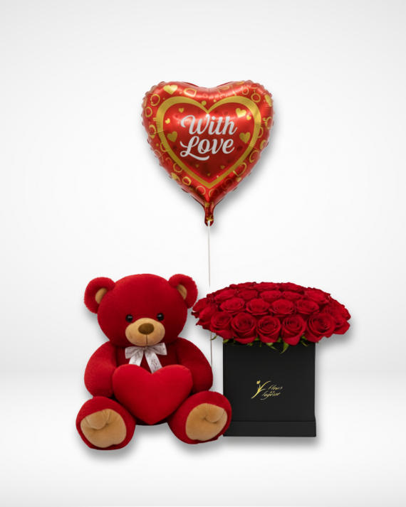 30 red roses in a heart shape box with a cute teddy bear and “I LOVE YOU” balloon