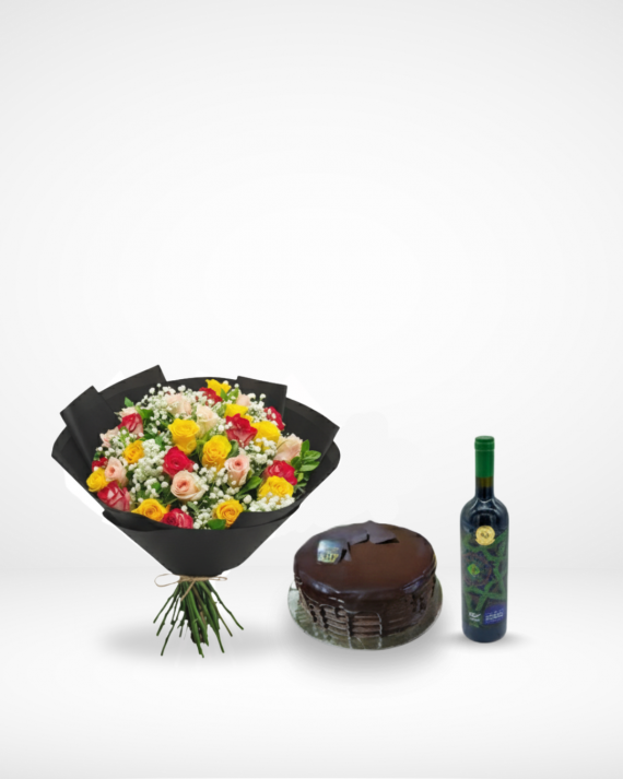 Bunch of 28 Roses and Baby Breath with Aziz Chocolate Cake and Wardy red wine.