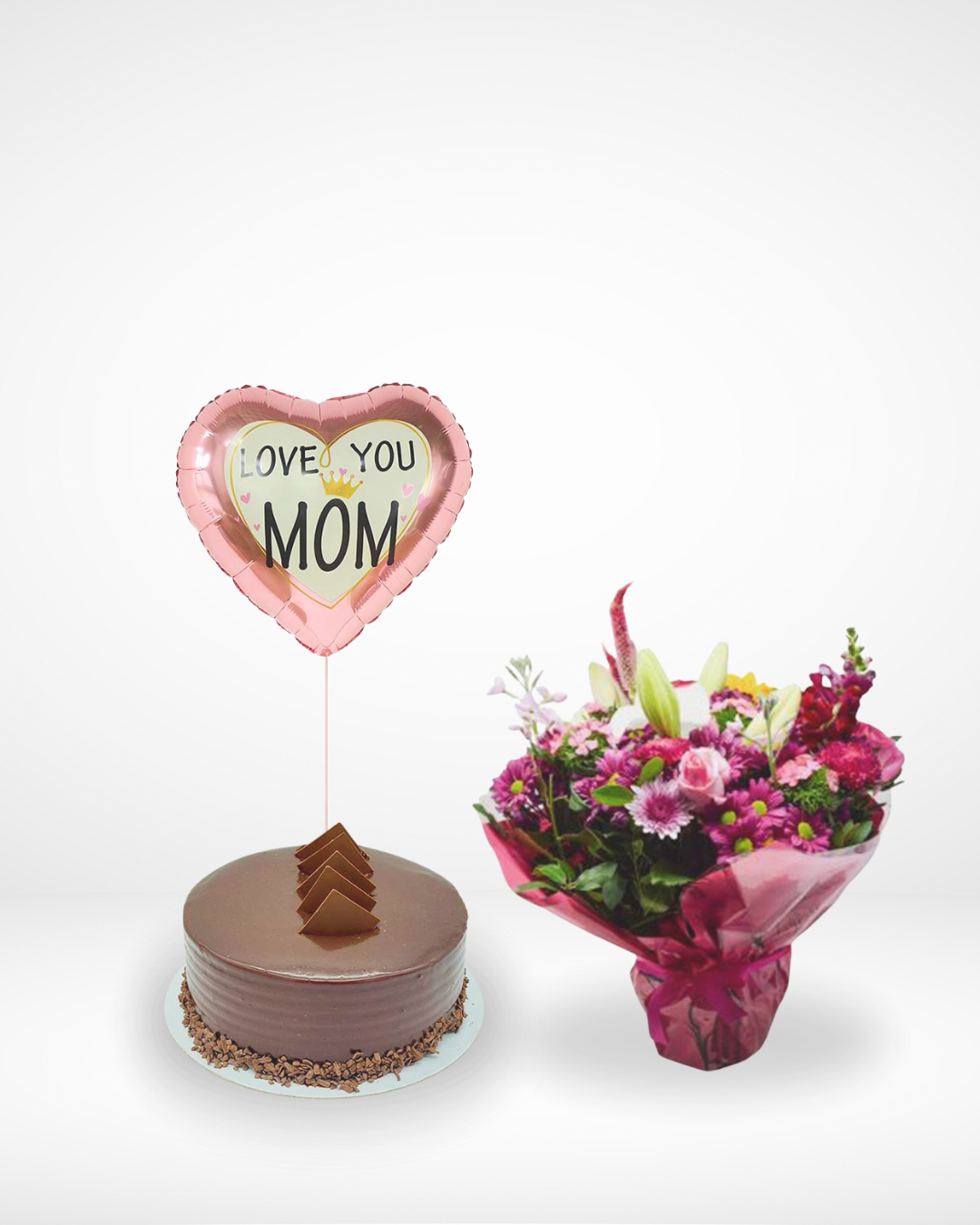 A pink arrangement , with a Chocolate Cake and a Balloon