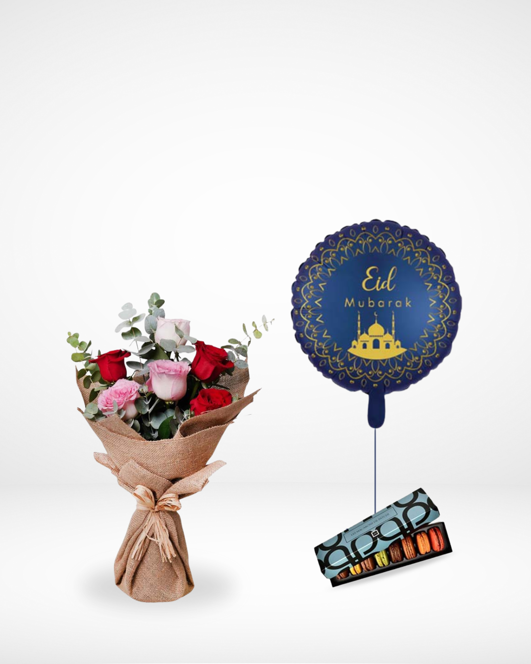 Special Ramadan Bouquet, with 8 Pcs of Patchi macarons and a balloon.