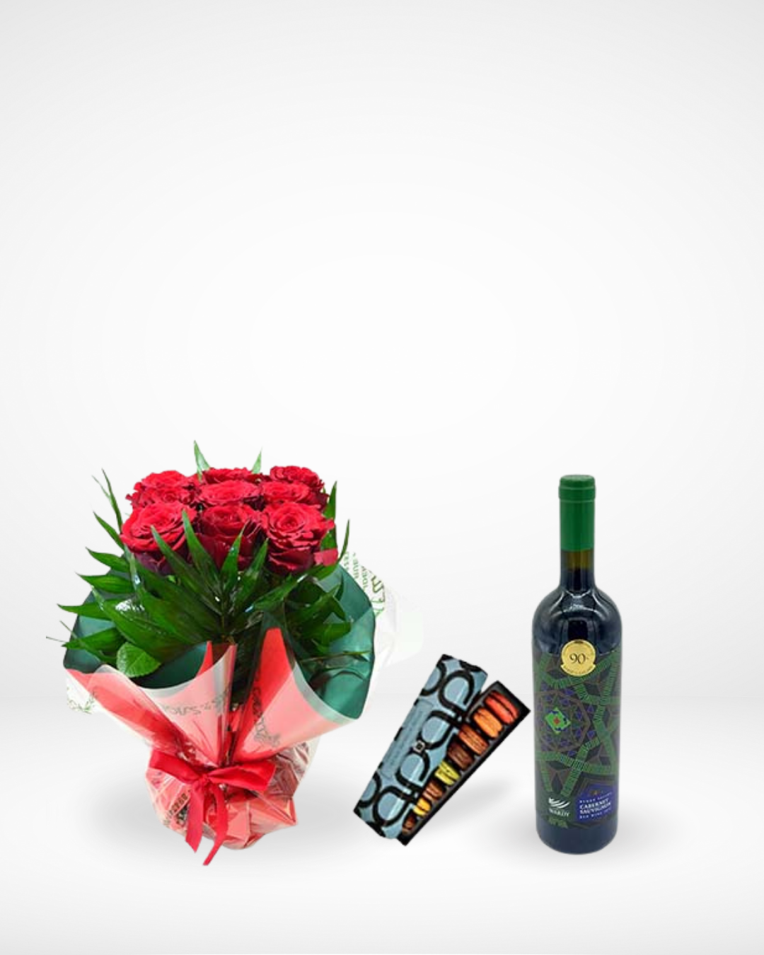 9 Flowers arrangement with Red Wine and 8 pcs Macaron