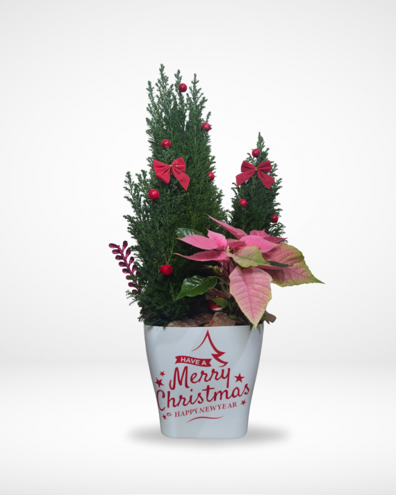 Celebrate the season with this vibrant and cheerful arrangement! Two miniature Cypress trees stand tall beside a beautiful pink Poinsettia, creating a lush, eye-catching holiday display. Same day delivery all over Lebanon!