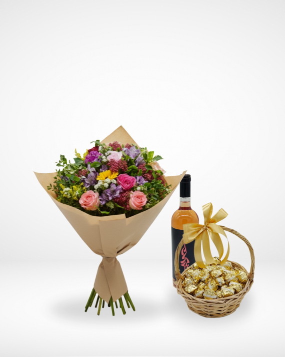 A bouquet of mixed flowers, with 500g of Chocolate and Rosé wine