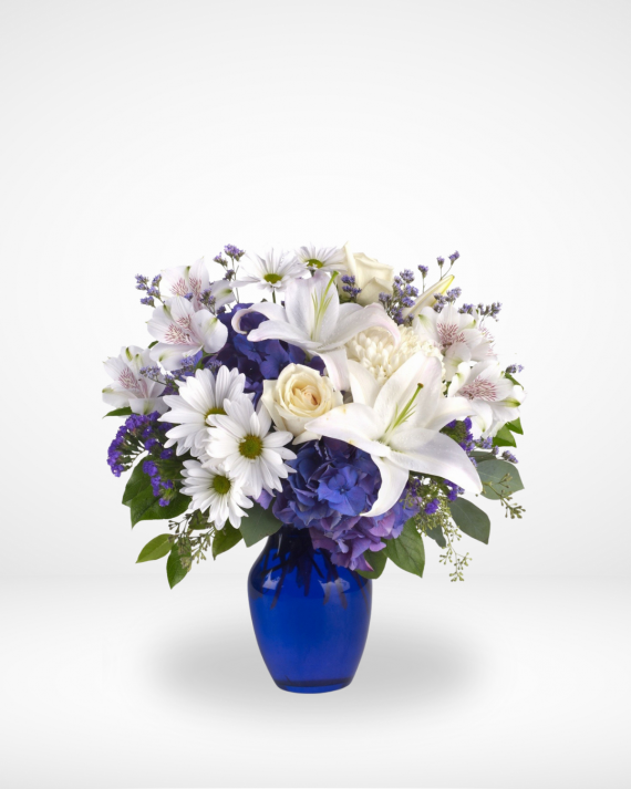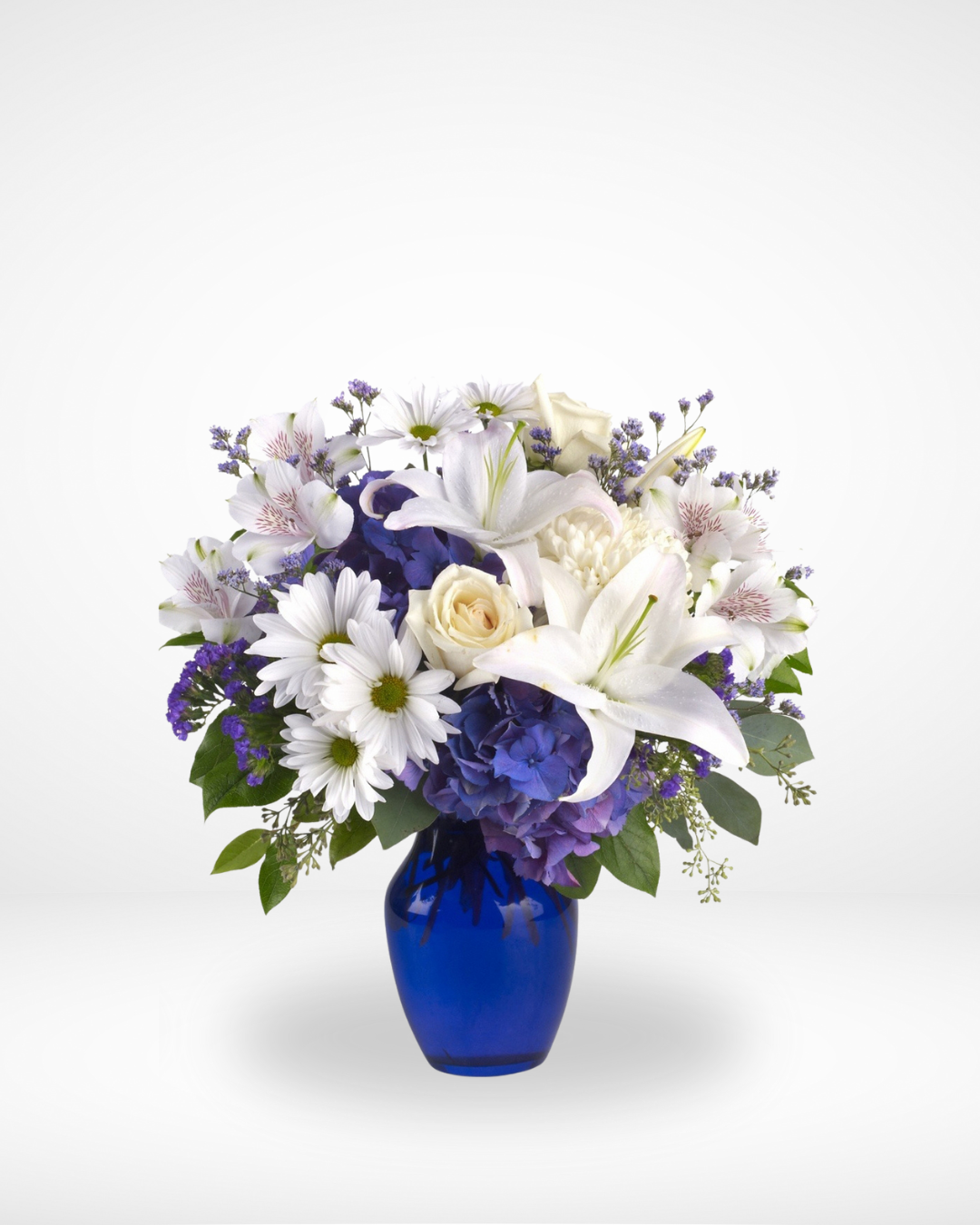Congratulate the parents with this mixture of blue flowers in a vase.
