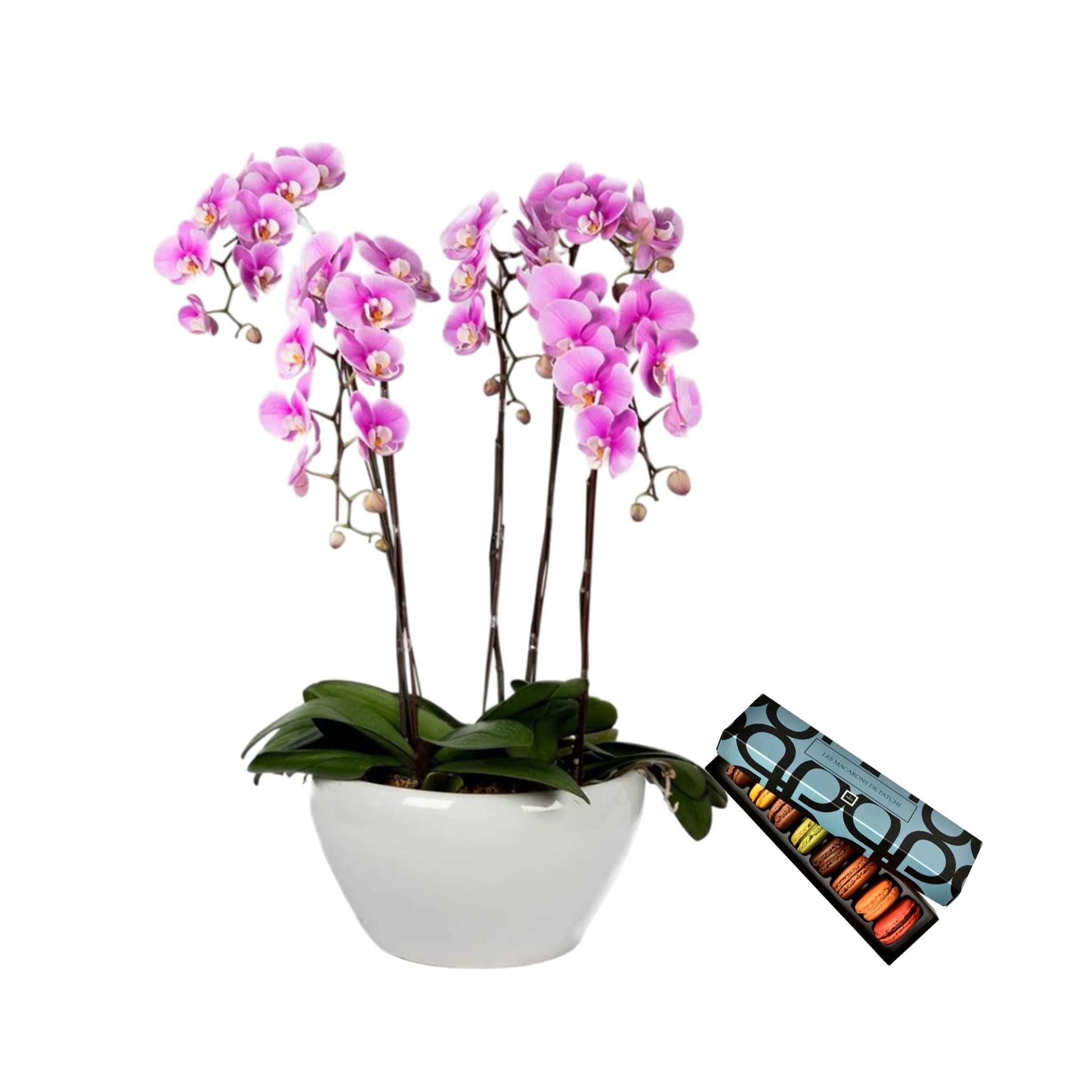 A delicate Orchid plant in a pot with 8 Pcs of Patchi macarons.