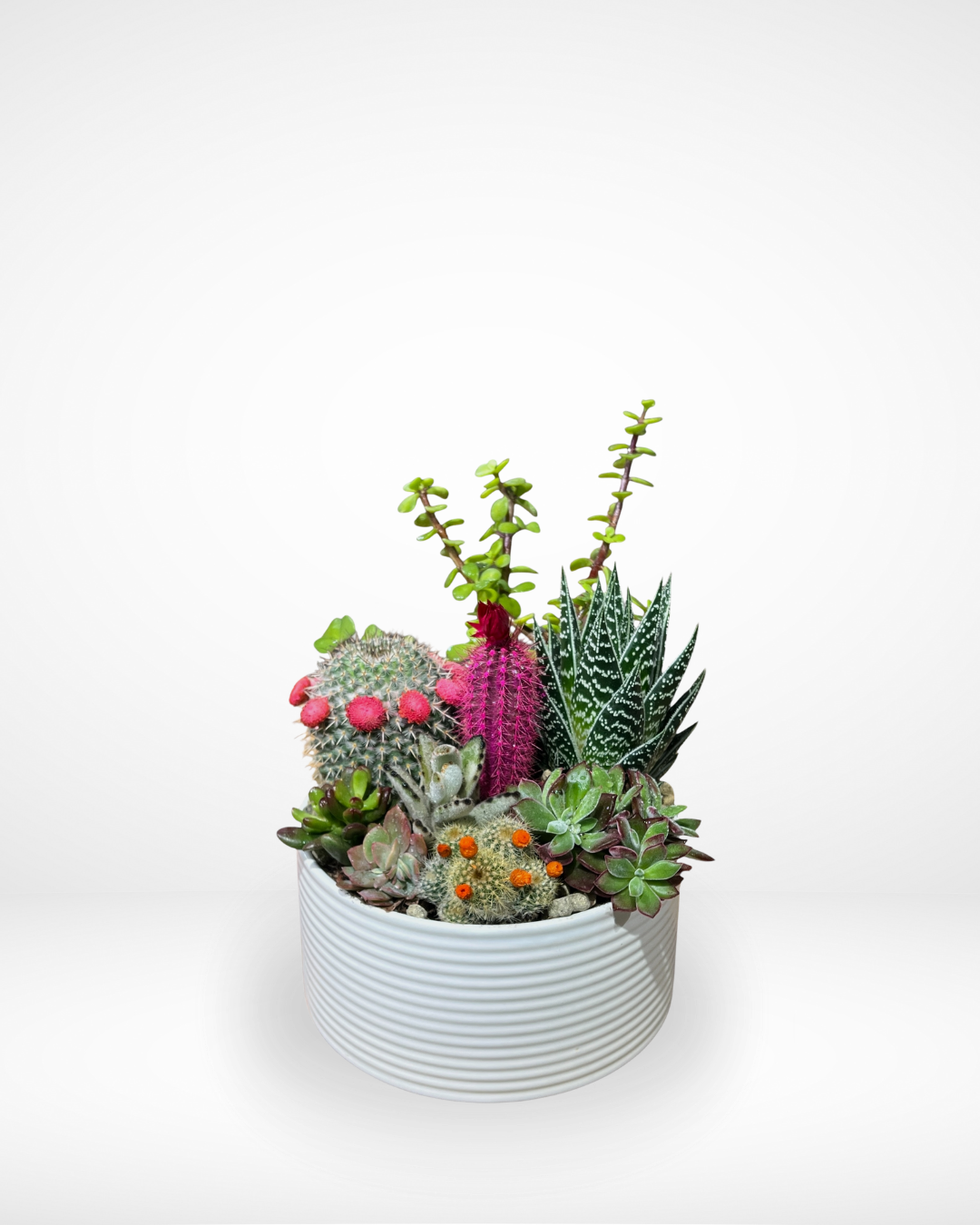 Arrangement of succulents with a pink cactus and unique desert garden.