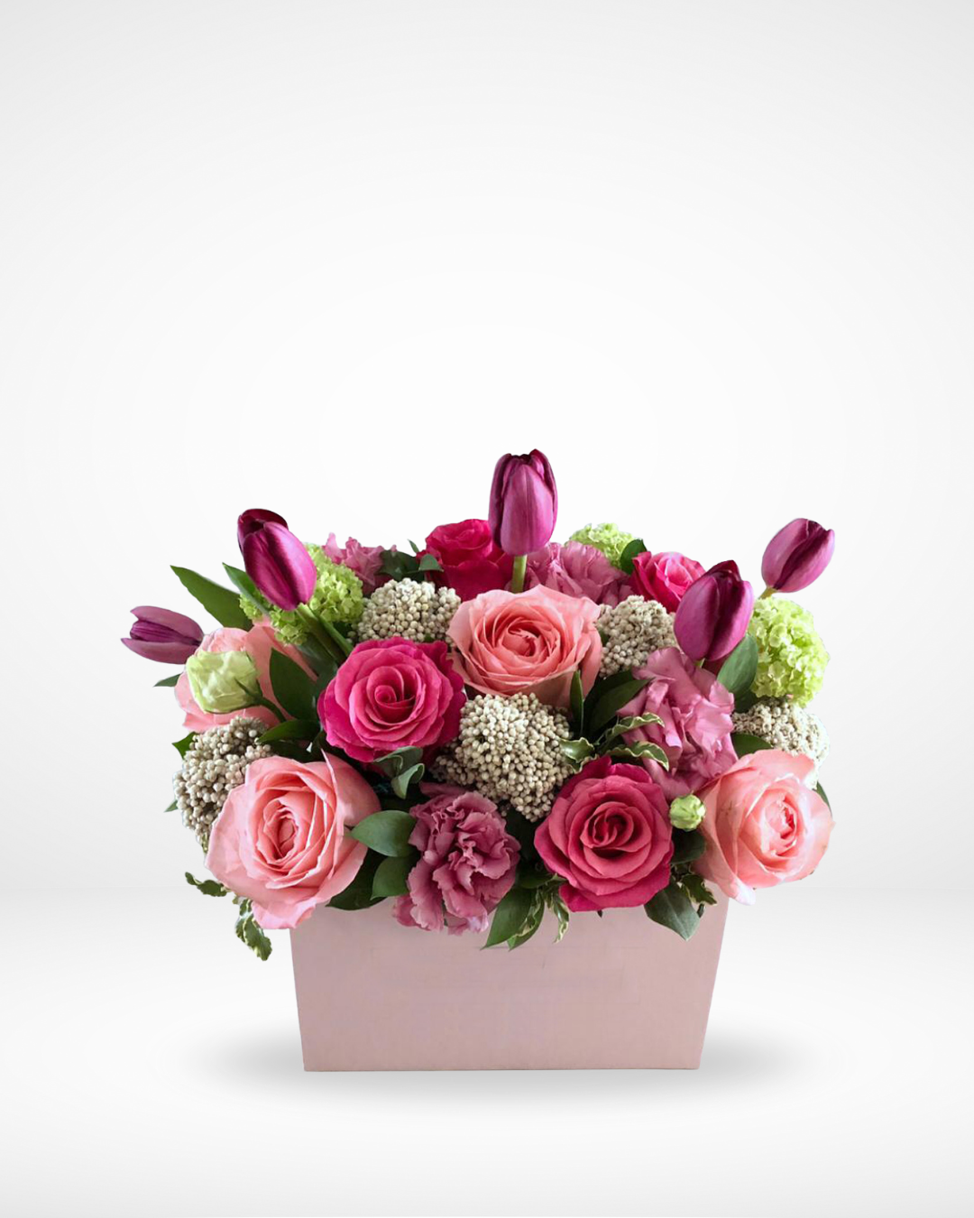 A Box With a Mix Of Pink Flowers And Greenery