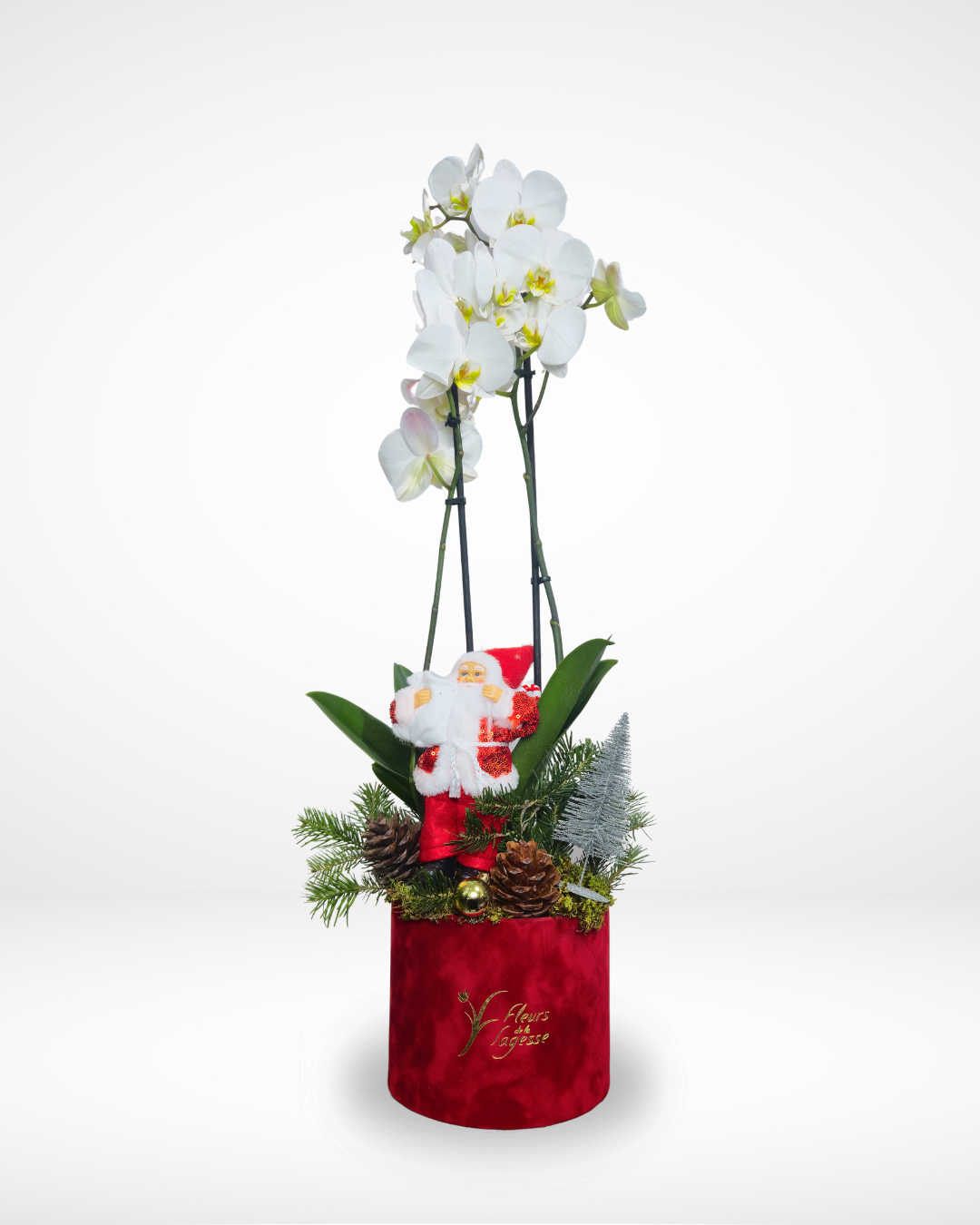 This luxurious floral display is a perfect blend of elegance and holiday cheer. Beautiful white orchids rise from a rich red box, enhanced by a charming Santa figurine and evergreen accents. We guarantee same day delivery all over Lebanon!