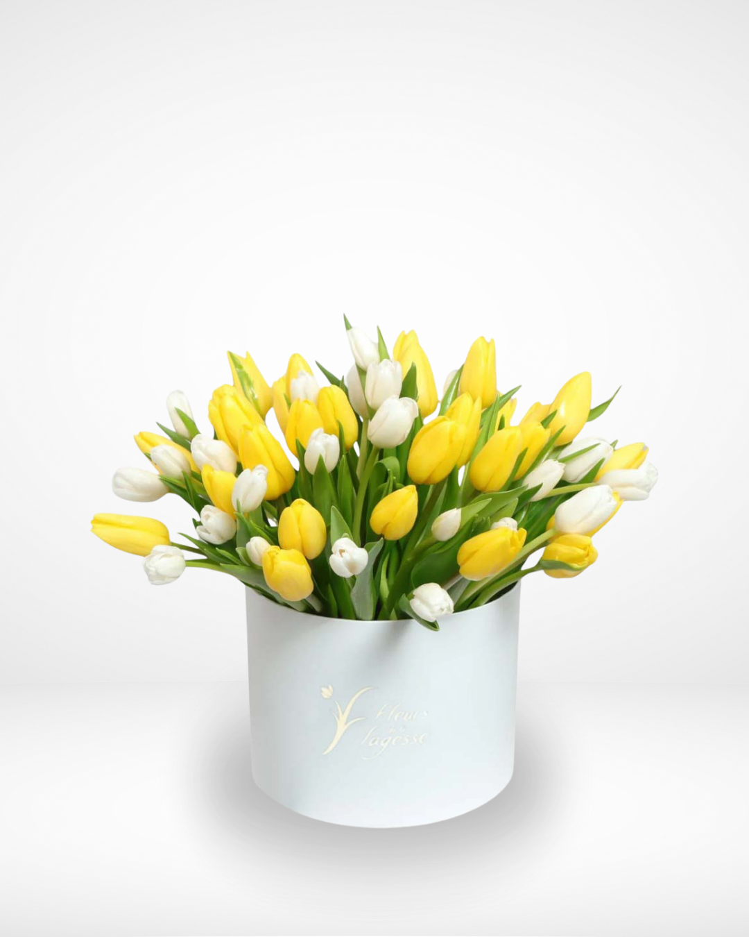 White and yellow tulips dance in harmony, like sunshine and snowflakes meeting in spring! Same day delivery in Beirut and all over Lebanon!