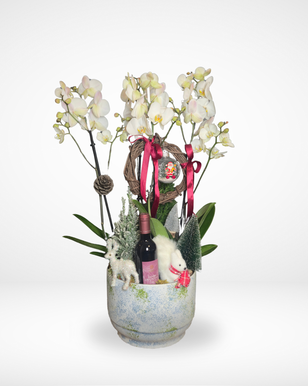 Capture the peaceful beauty of a snowy forest with this exquisite arrangement. Elegant white orchids stand tall, surrounded by miniature trees, a decorative wreath, and charming figurines. It also includes a bottle of red wine, making this a unique and comprehensive gift. Benefit from our same day delivery all over Lebanon!