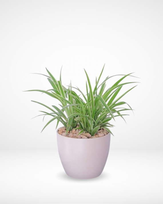 Spider plant (scientific name: Chlorophytum comosum) is a popular, low-maintenance houseplant native to South Africa. Known for its long, arching green leaves with white or yellow stripes, the spider plant is also famous for producing small “babies” or offshoots that dangle from the mother plant. It is easy to grow, thrives in a variety of light conditions, and is an effective air purifier. Spider plants prefer well-draining soil and moderate watering, allowing the soil to dry out between waterings. They are safe for pets, making them a great choice for households with animals.