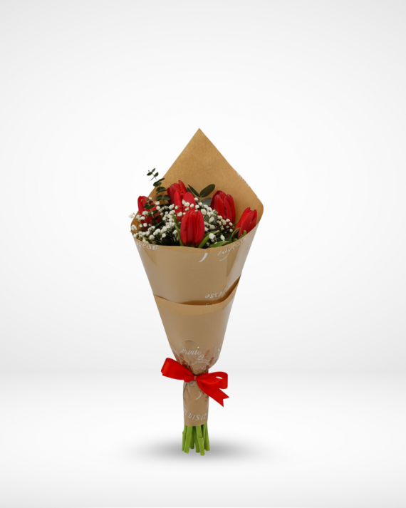 6 red tulips with eucalyptus and gypsophiles.