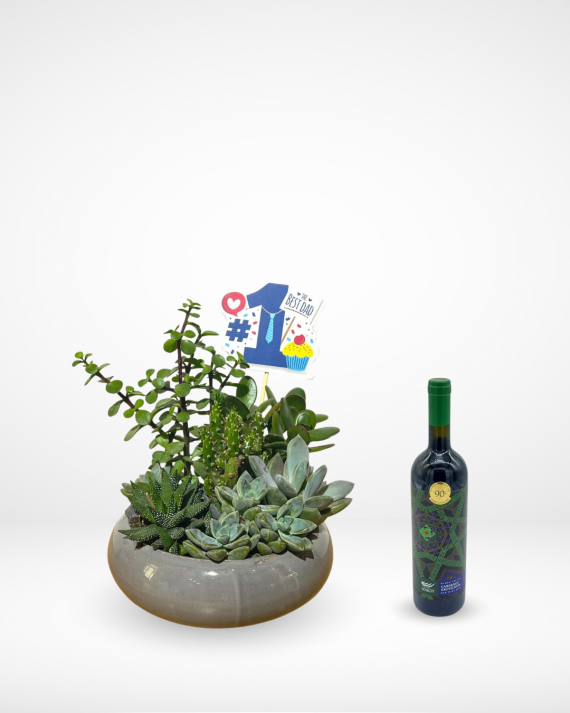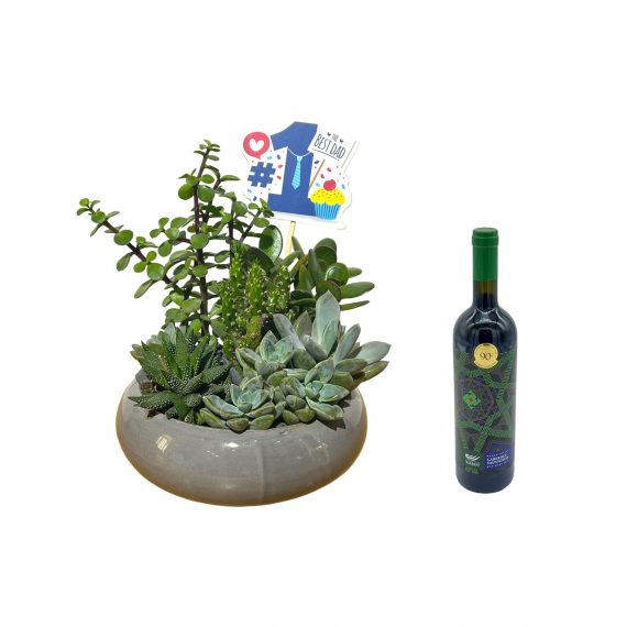 A Mix of Succulents in a Ceramic Pot with Wardy Red Wine bottle.