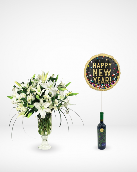 Peaceful White Mix in a Vase with red wine and happy new year balloon.