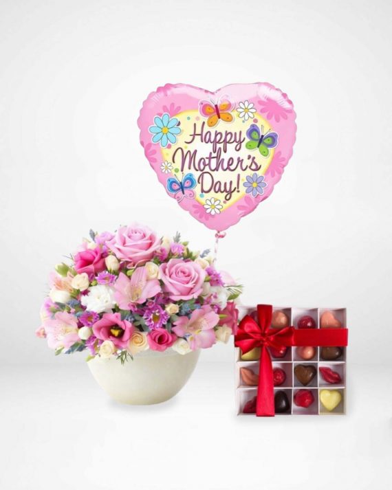 Brighten Mom’s day with Blooms & Hearts for Mom: a colorful flower arrangement, 16 heart-shaped chocolates, and a festive balloon for a sweet and cheerful Mother’s Day.
