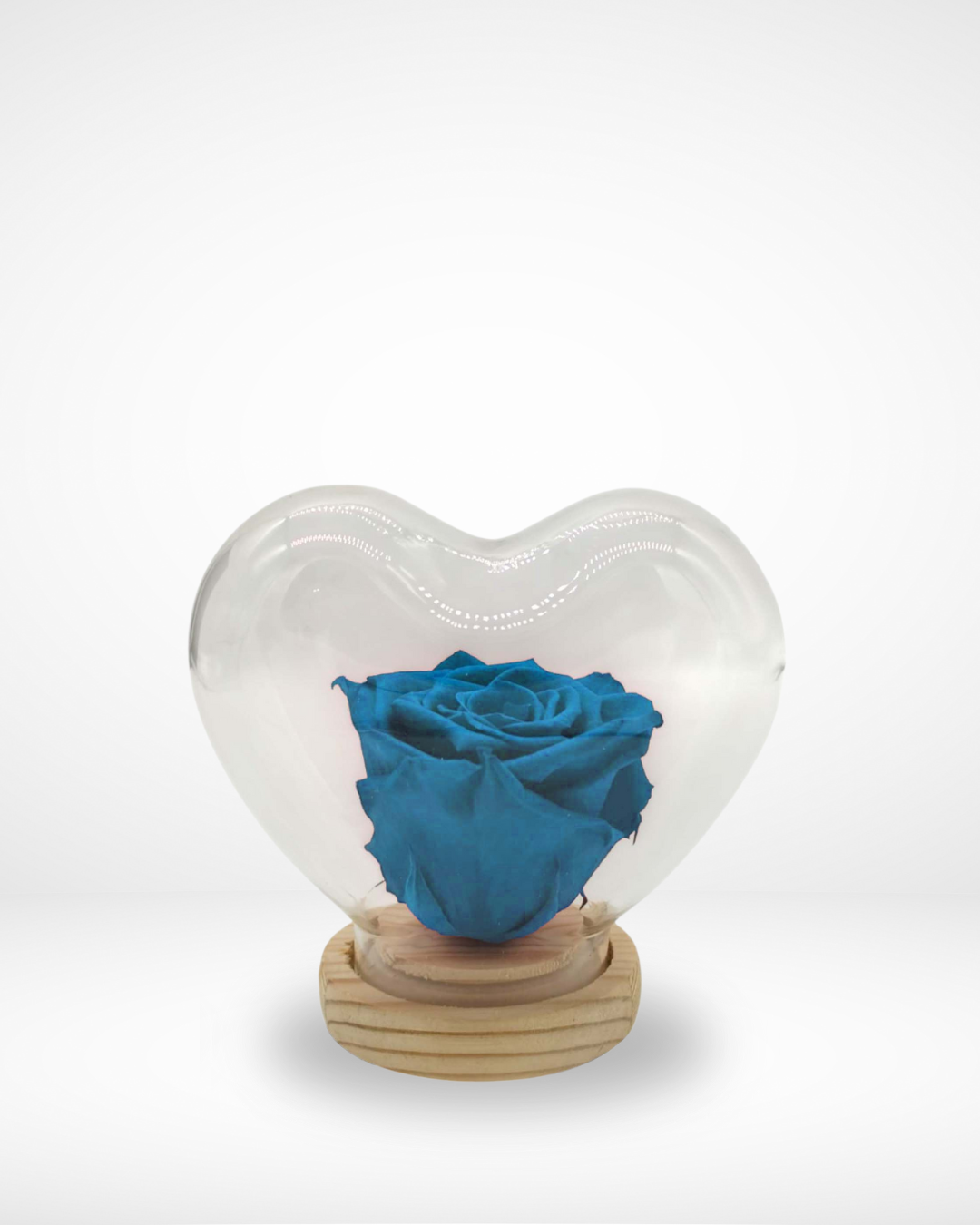 Delicate and peaceful, this preserved light blue rose sits gracefully in a heart-shaped transparent glass, symbolizing trust, loyalty, and emotional calm. Same day delivery all over Lebanon.