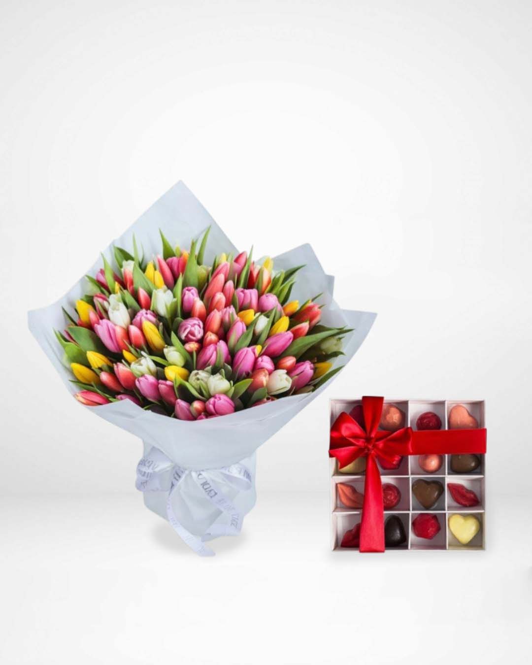 This beautiful arrangement includes 100 fresh mixed-color tulips,It comes with a delicious 16-piece heart-shaped chocolate box. Same-day delivery available all over Lebanon.