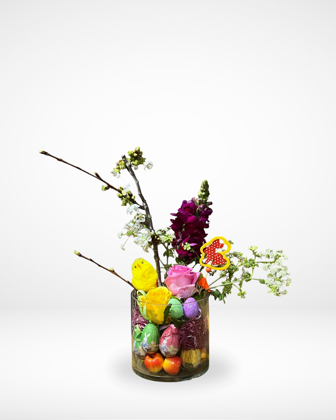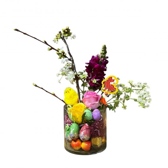 A modern springtime arrangement that balances soft white foliage with a burst of colorful eggs. Same day delivery all over Lebanon.