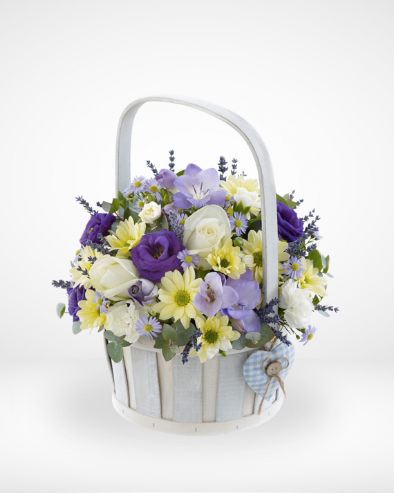 Congratulate the new born baby’s parents with a special mixture of white and blue flowers in a basket.