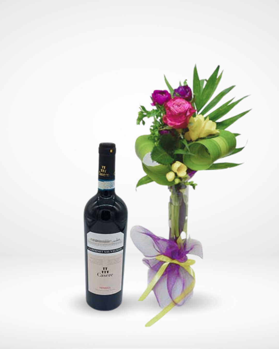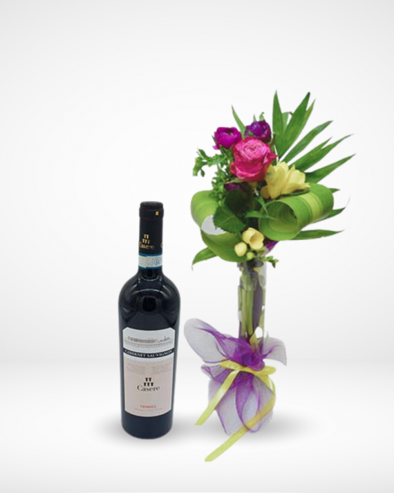 Fresh Rose in a Glass Vase and Red Wine Bottle