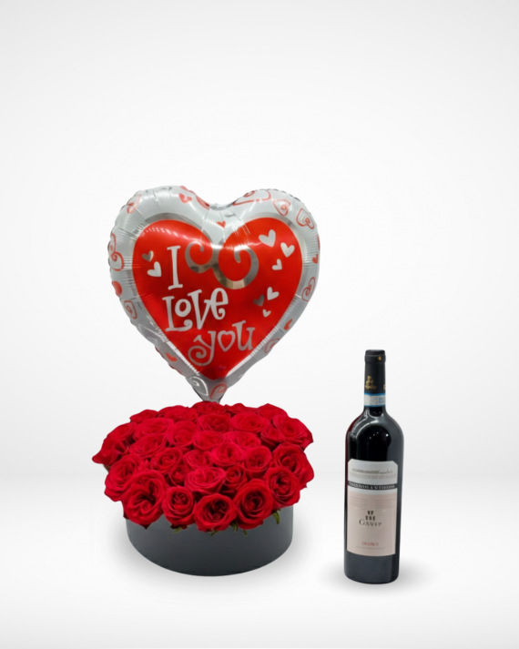 25 red roses in a heart shape box with a red wine bottle and a 18 inch “I LOVE YOU” balloon