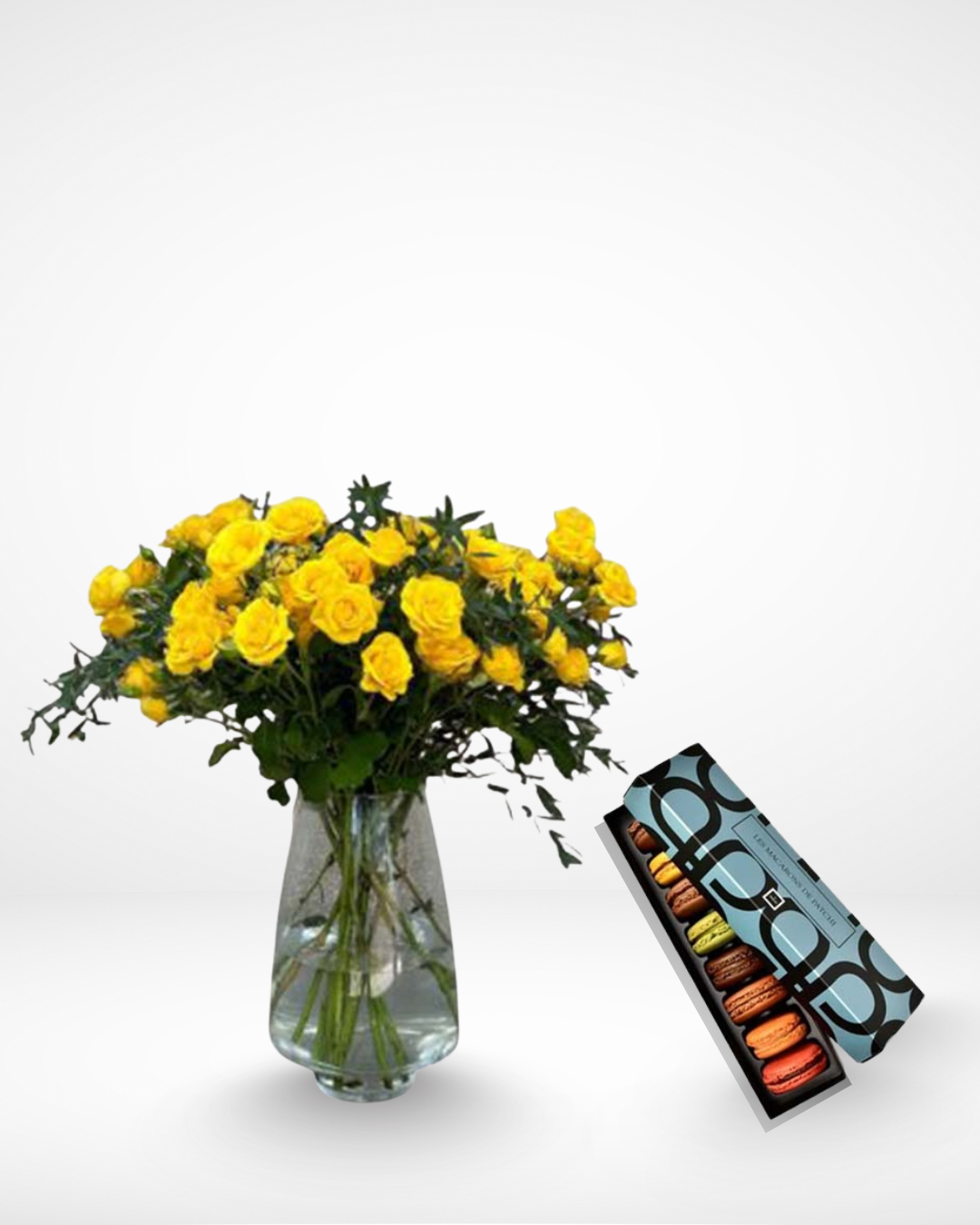 Vase with 20 yellow baby roses with and 8 Pcs of Macarons.